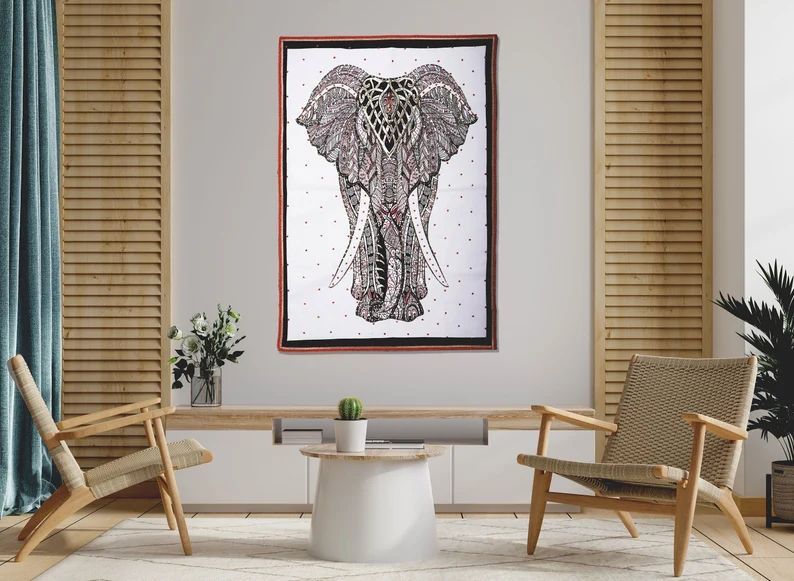 The elephant tapestry symbolizes strength, patience and power of body and mind both. The Elephant is also symbolic to sensitivity, wisdom, stability, loyalty, intelligence, peace, reliability and determination, which are all seen in the animal's nature