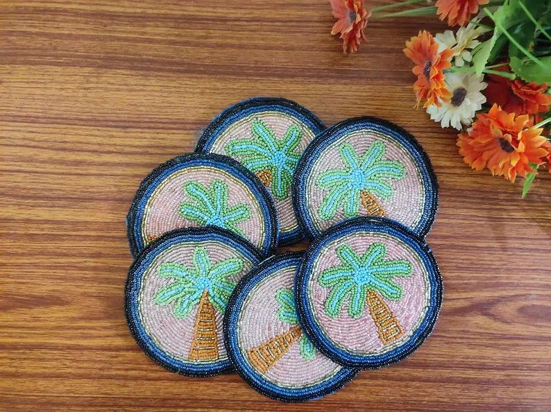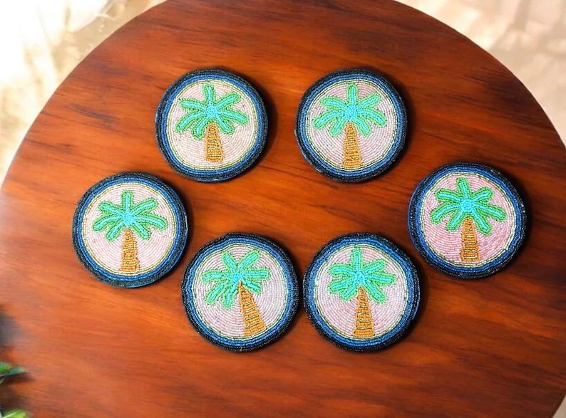 Handmade Blue Green Palm Leaves Garden theme Beaded drink Coasters - Set of 6, Drink coasters for Christmas, Homeware Table topper decor, Vintage Embroidery Art, Christmas Table decor, Dining table decorative, Festive Coffee table decor, Gift for mum and her, New Year eve, Winter indoor hosting gatherings and tea party's, handmade gifting