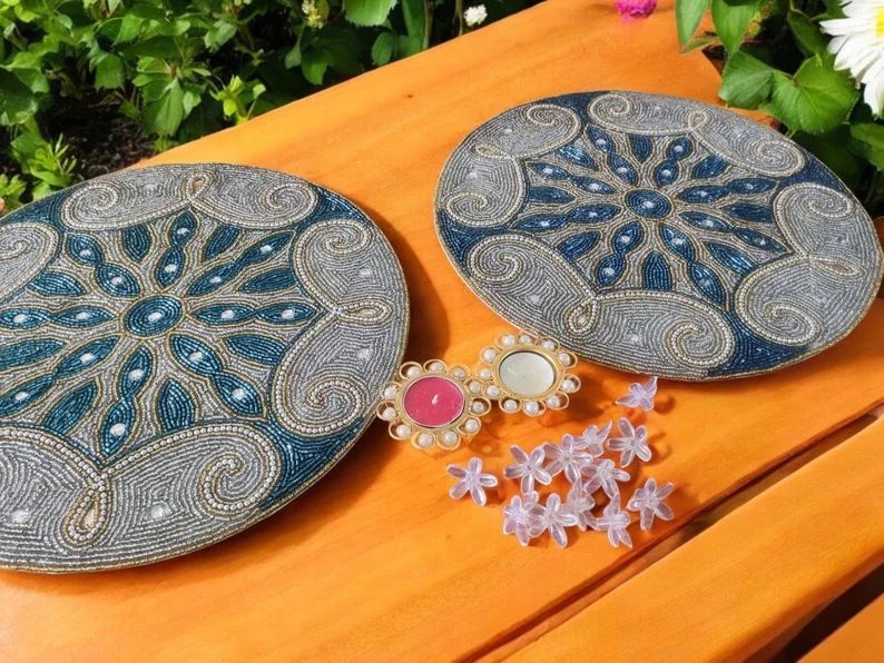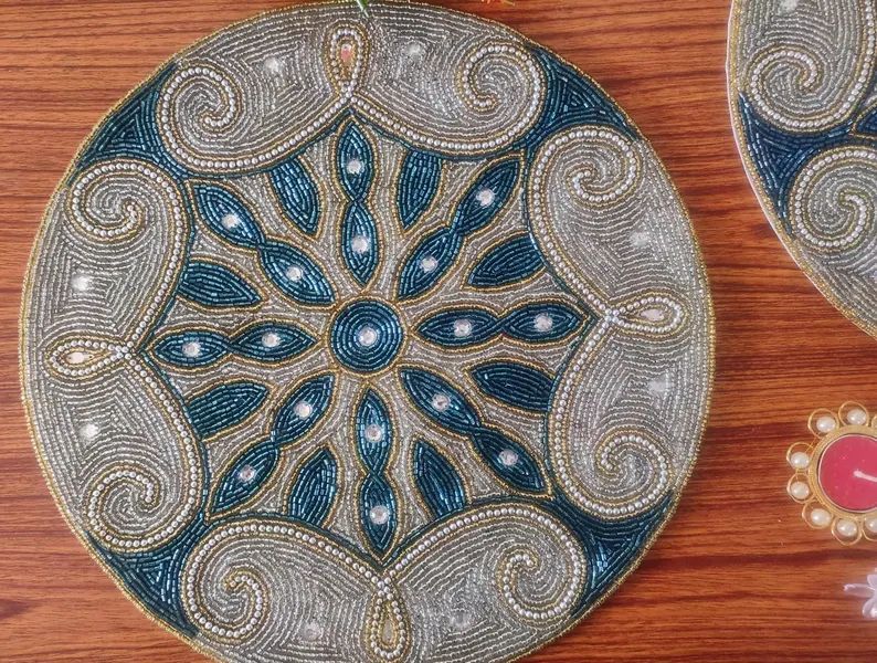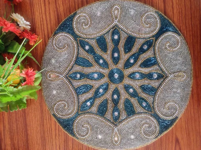 This holiday season, bring home these beautifully handcrafted Christmas/winter festive blue golden abstract patterned beaded table Toppers / Tablemats and adorn any area in the most stylish way.