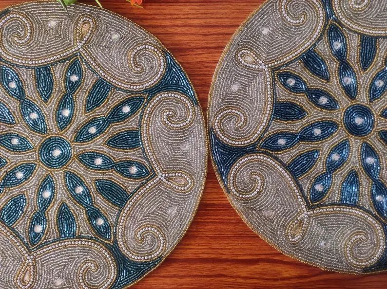 Handmade Festive special Golden & Royale Blue Paisley motifs beaded Placemats, dining decorative, unique Table topper, home decor, dining table decor, mother's day, gift for her etc.