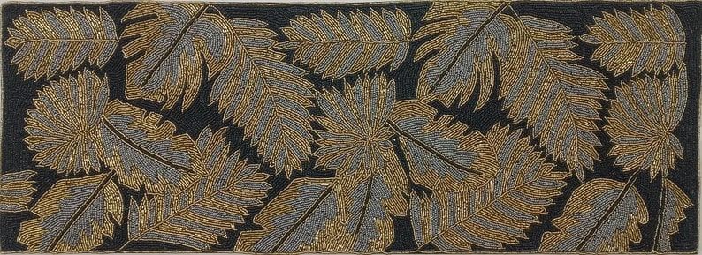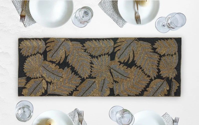This festive season, decorate your tables with this beautifully handcrafted golden black palm leaves beaded table runner. This eclectic dining table topper looks best on any diner table or center table. It is made of gold black highquality beads knotted together with perfect finish and heavy back support is given for more durability.