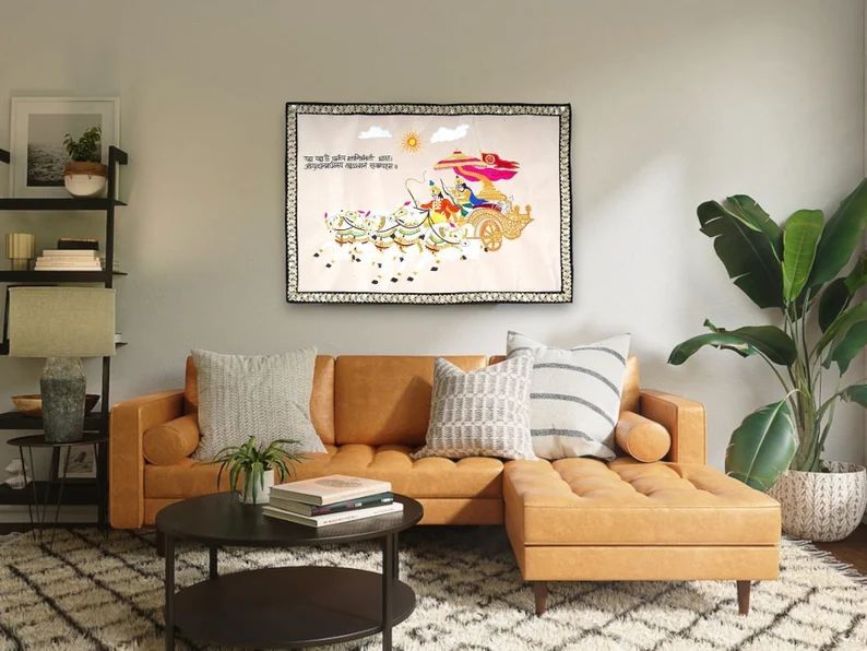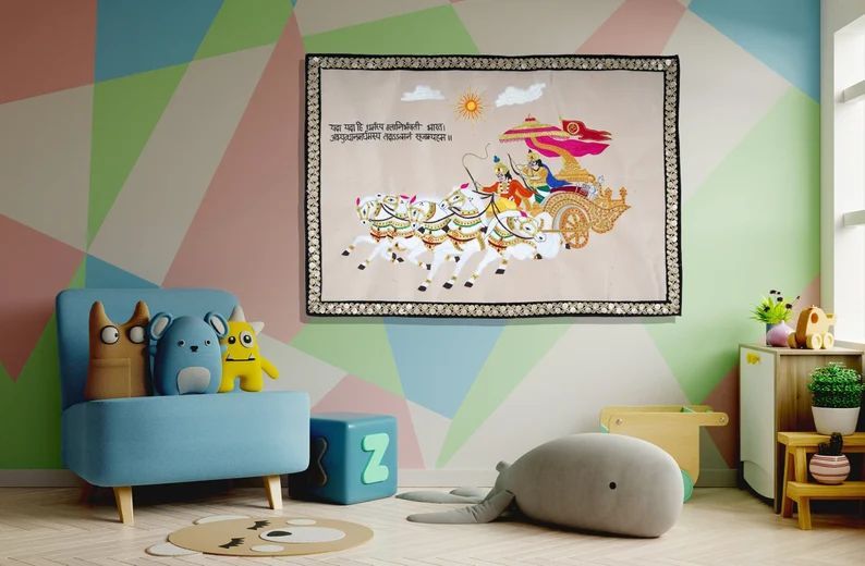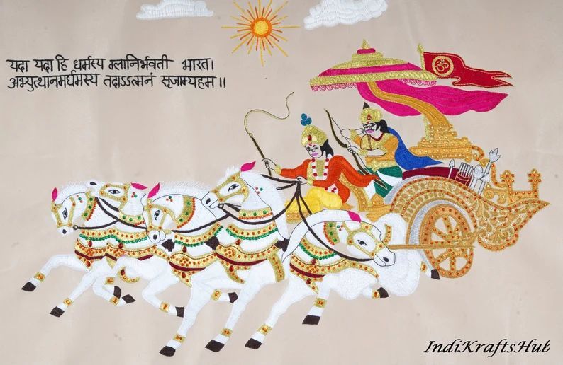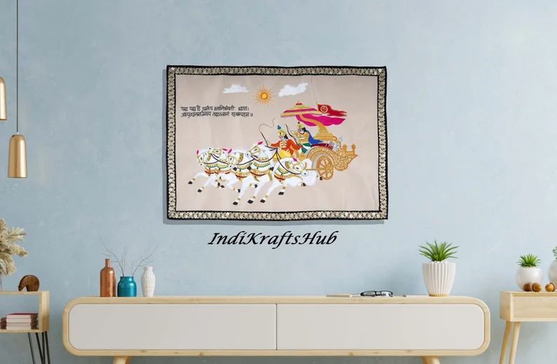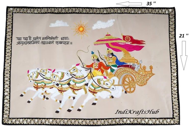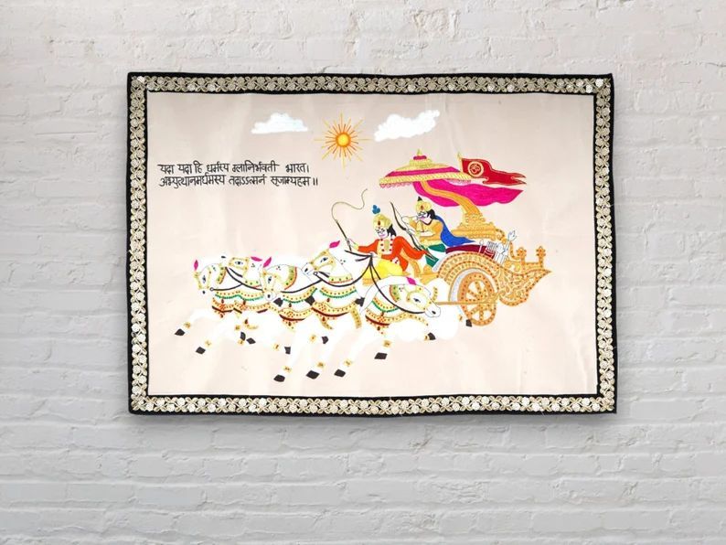 Handmade Hindu God Krishna & Arjuna Tapestry wall hanging, Inspirational Lord Krishna & Arjuna Mahabharat scene hantha chain stitch embroidery Wall hanging - Inspirational Fabric Poster for Home decor, Dorm Decor, offices etc