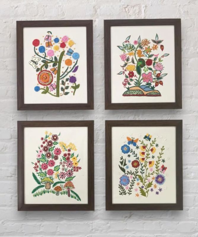 Mid century vintage inspired set of 2 or 4 boho abstract floral Hand embroidered wildflowers on canvas fabric with Glass frame for wall hanging. These looks elegant and charming when hang together on any wall and gives fresh looks to your living area : bedroom, living room, lobby etc. With their pastel shades, they look blissful and gives fresh & happy vibes to your walls and surroundings.