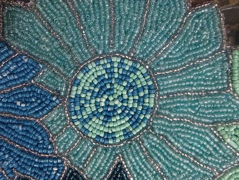 Material: 70% glass beads, 30% plastic beads. Heavy material used for backing.